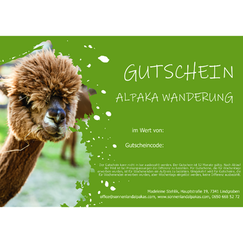 Gutschein für eine Alpaka Wanderung, von Montag bis Donnerstag. Achtung: wenn der Gutschein am Wochenende, an Feiertagen oder in den Ferien eingelöst wird, muss ein Aufpreis bezahlt werden.